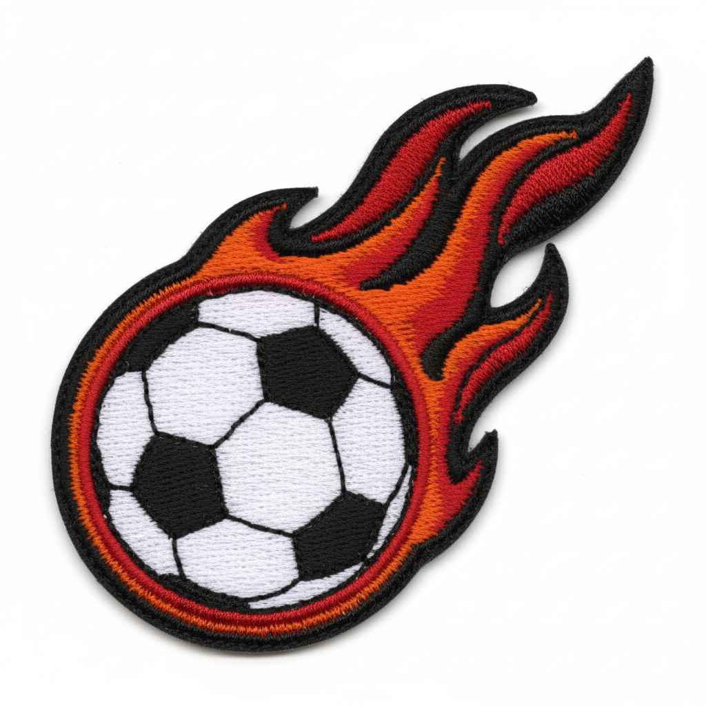 Parche bordado balón de fuego con colores intensos y diseño dinámico. Ideal para ropa deportiva, mochilas y amantes del fútbol.