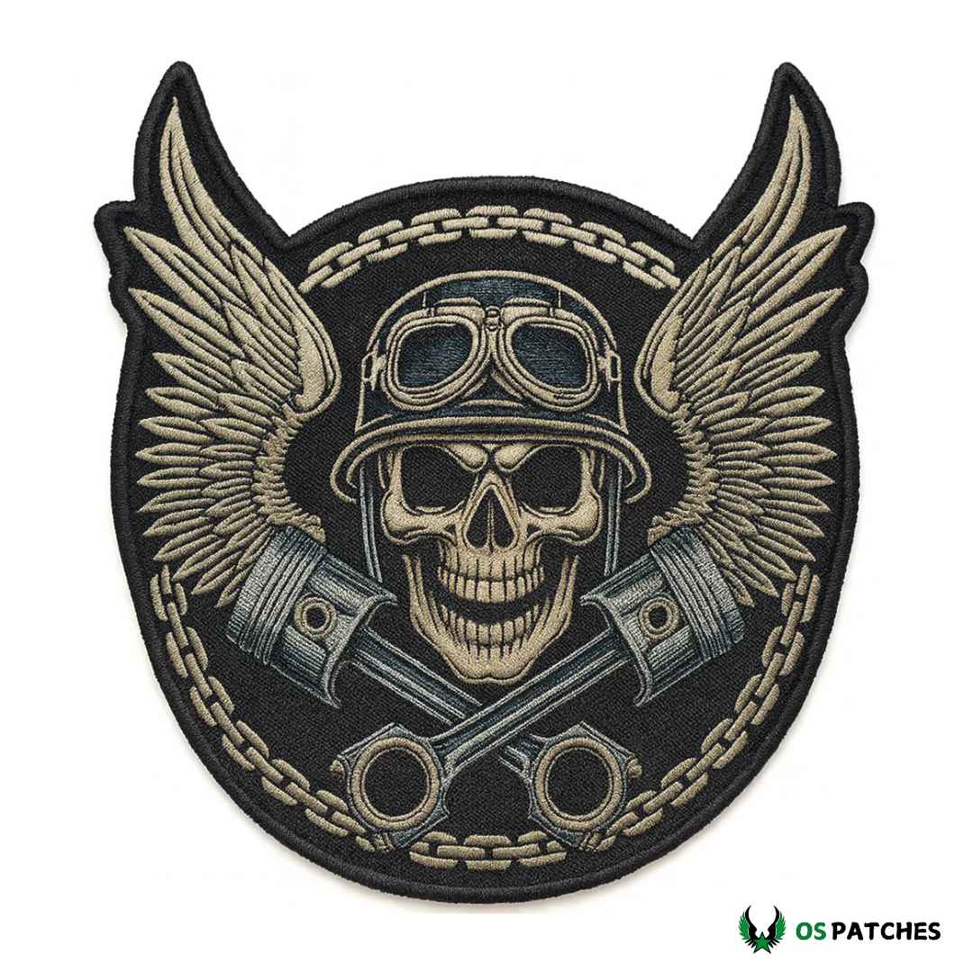 Este parche bordado muestra una calavera con casco y gafas, acompañada de alas extendidas y pistones cruzados, enmarcada con una cadena metálica. Su estilo rudo y detallado lo convierte en un accesorio imprescindible para motociclistas y amantes del look rebelde.