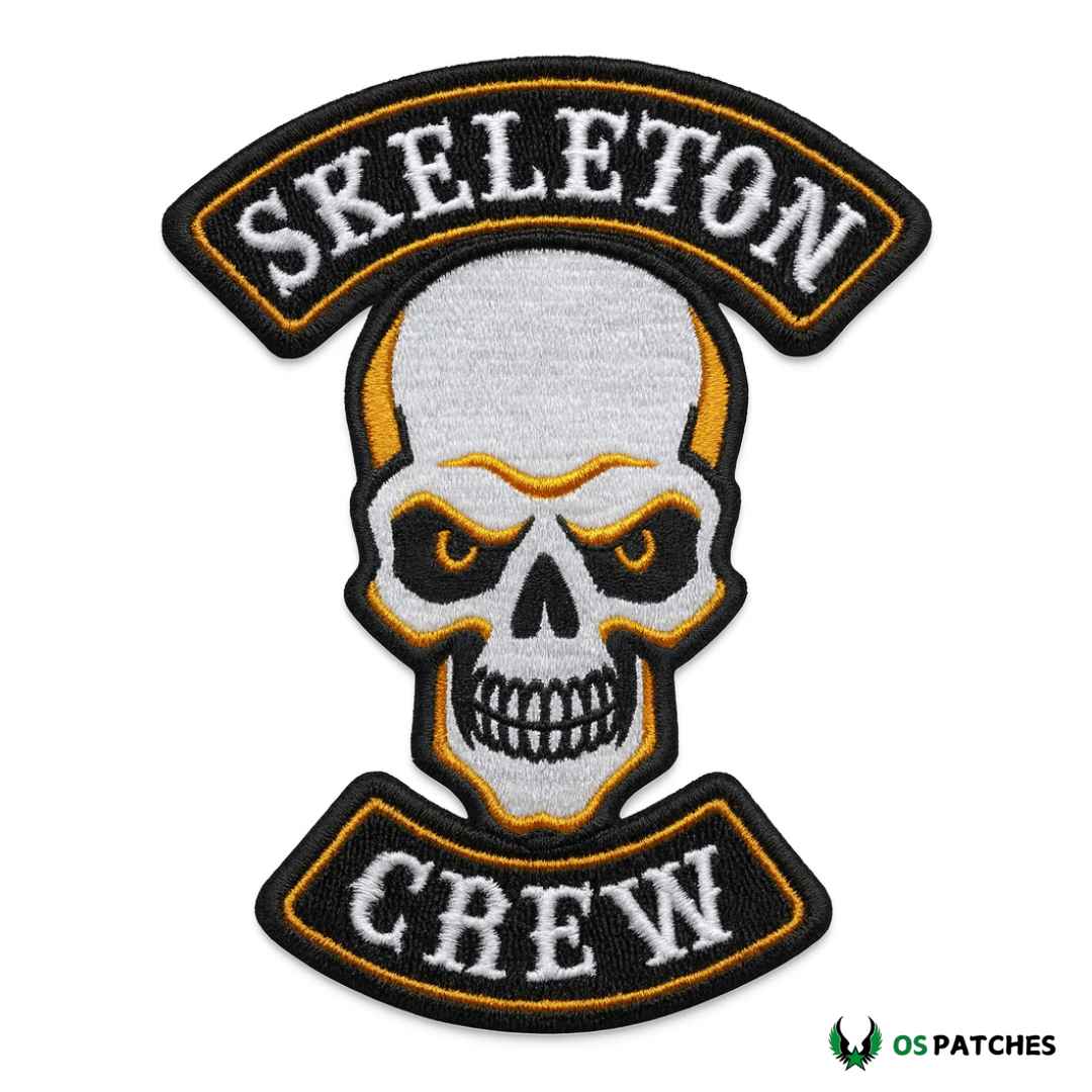 Parche bordado con diseño de calavera y la frase Skeleton Crew, en tonos blanco, negro y detalles en amarillo. Su estilo llamativo y fuerte lo convierte en un accesorio ideal para chaquetas, mochilas, chalecos o ropa biker. Fabricado con hilos resistentes y acabado de alta calidad, garantiza durabilidad y un aspecto impresionante. Disponible con velcro, plancha o costura según tu preferencia.