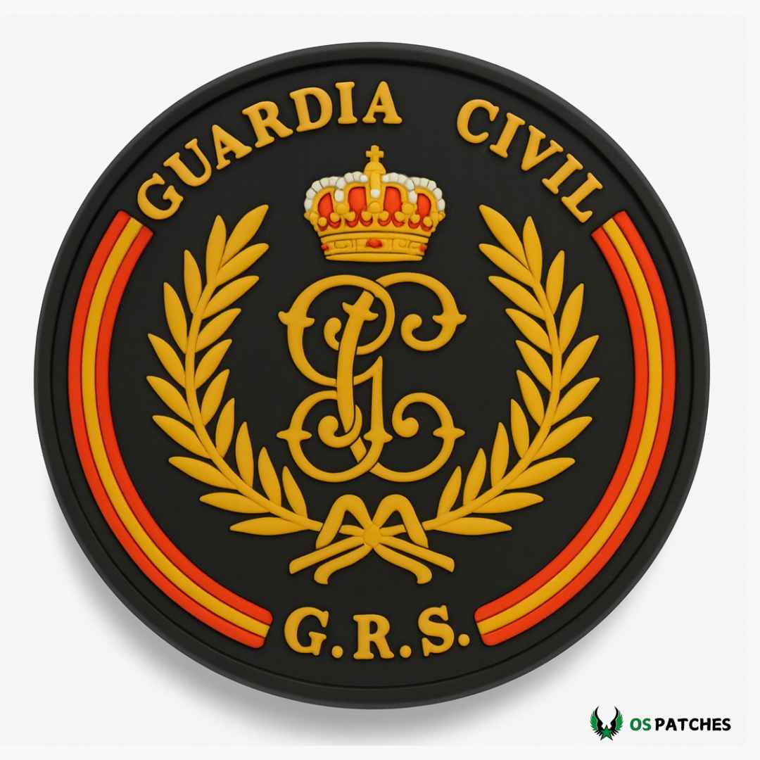 Parche circular en PVC de la Guardia Civil GRS (Grupos de Reserva y Seguridad). Presenta en relieve la corona real, ramas de laurel y las siglas GC en el centro. Su diseño en negro y dorado aporta un acabado elegante y resistente. Fabricado en material flexible y duradero, ideal para uniformes, chalecos tácticos o como pieza de colección. Mantiene los colores vivos y un acabado profesional en cualquier uso.