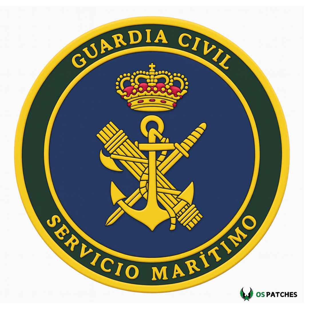 Parche redondo de la Guardia Civil – Servicio Marítimo fabricado en PVC. El diseño muestra un ancla en el centro con espada y fasces cruzados, coronados por la corona real. Su material es flexible, resistente y mantiene los colores vivos por más tiempo. Ideal para uniformes, prendas tácticas o coleccionistas que buscan símbolos auténticos de la unidad naval.
