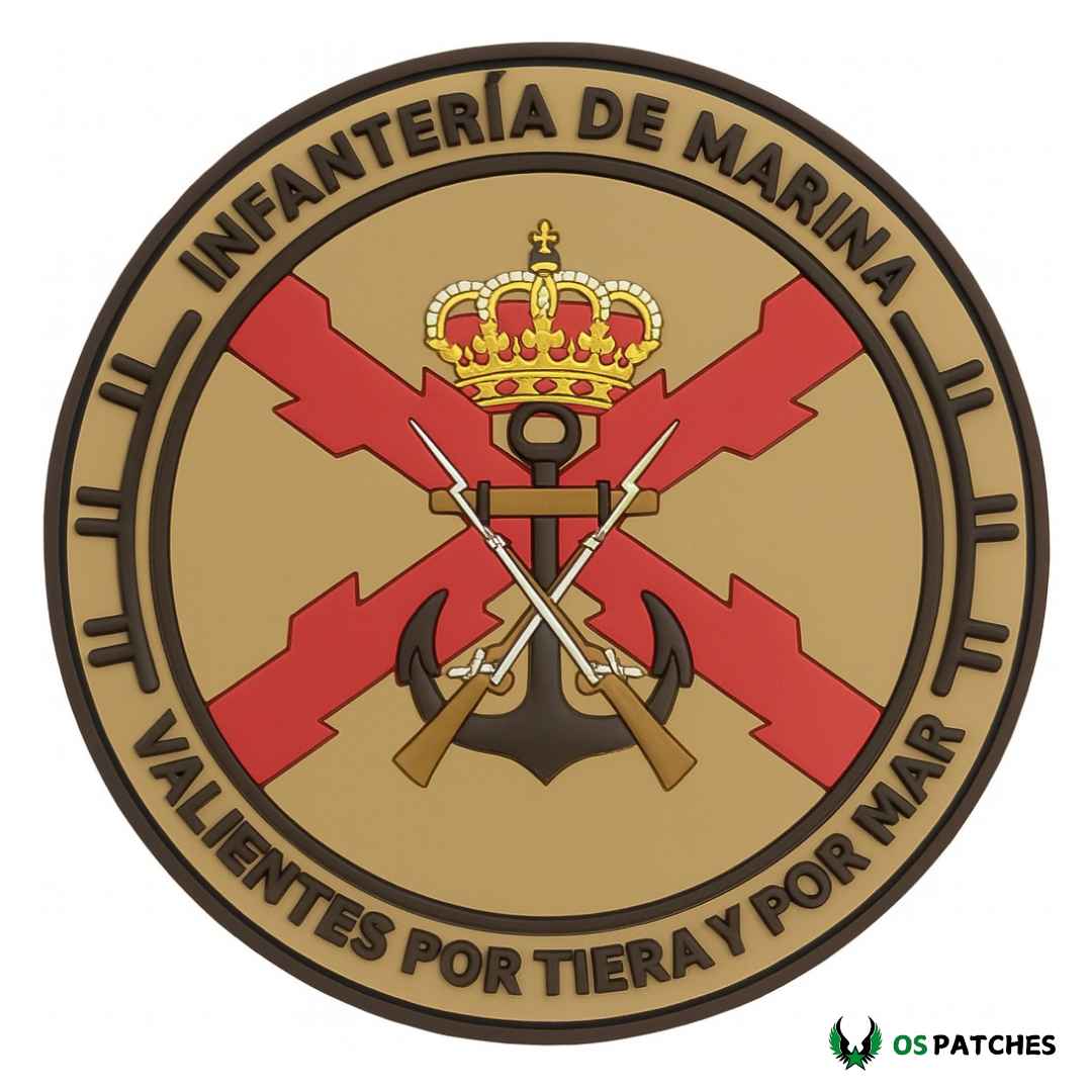 Este parche PVC Infantería de Marina representa el emblema oficial de esta fuerza con gran detalle. El diseño circular incluye la corona real, un ancla negra, dos fusiles cruzados y la cruz de Borgoña roja como fondo. El borde exterior luce el lema “Valientes por tierra y por mar”, símbolo de orgullo y tradición militar.