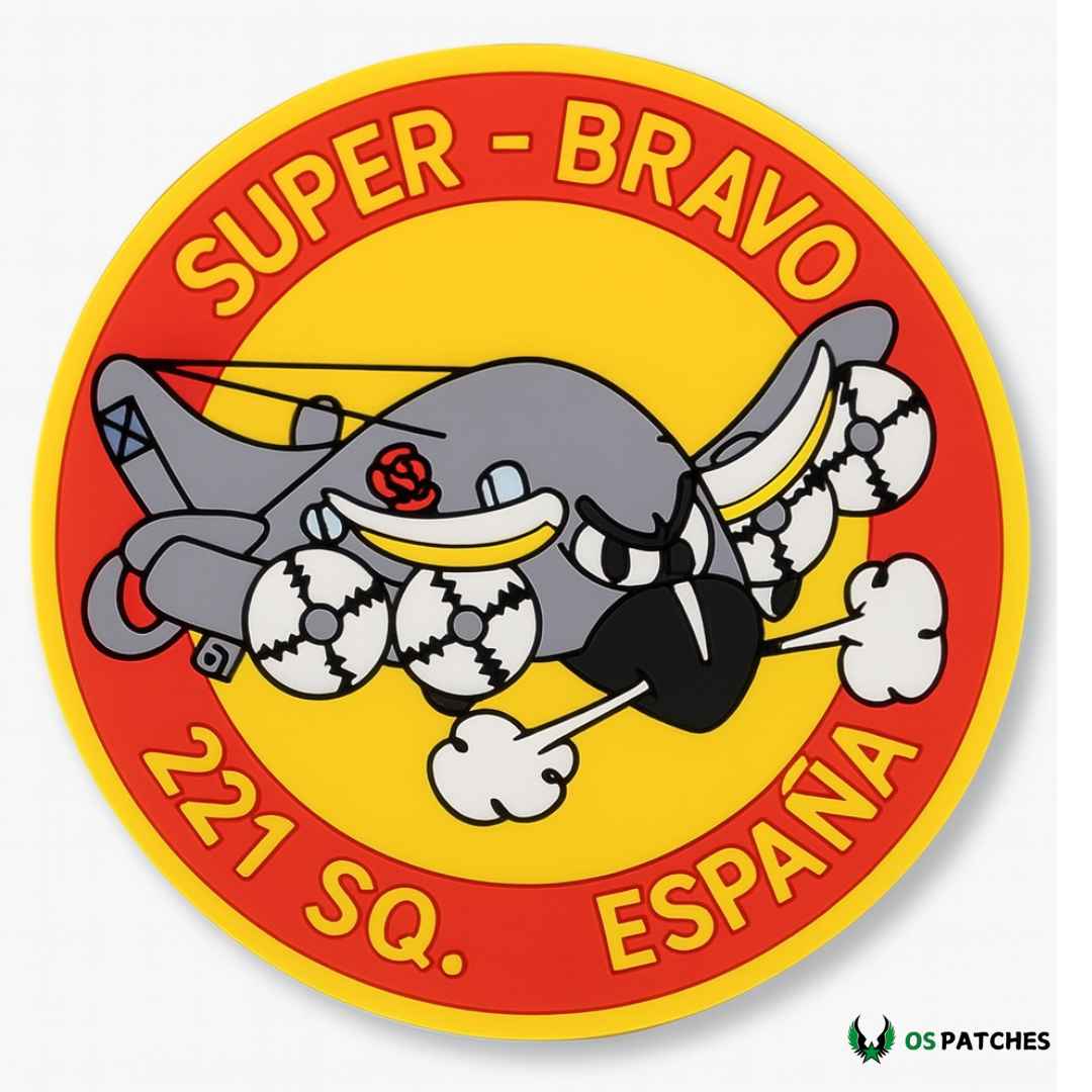 Parche de PVC del Super Bravo 221 SQ España, con un diseño llamativo y caricaturesco que representa la fuerza y el espíritu del escuadrón. Fabricado en PVC flexible y duradero, es resistente al agua, al calor y al desgaste. Su acabado en relieve y colores vivos lo convierten en un accesorio ideal para uniformes, mochilas tácticas y colecciones militares.