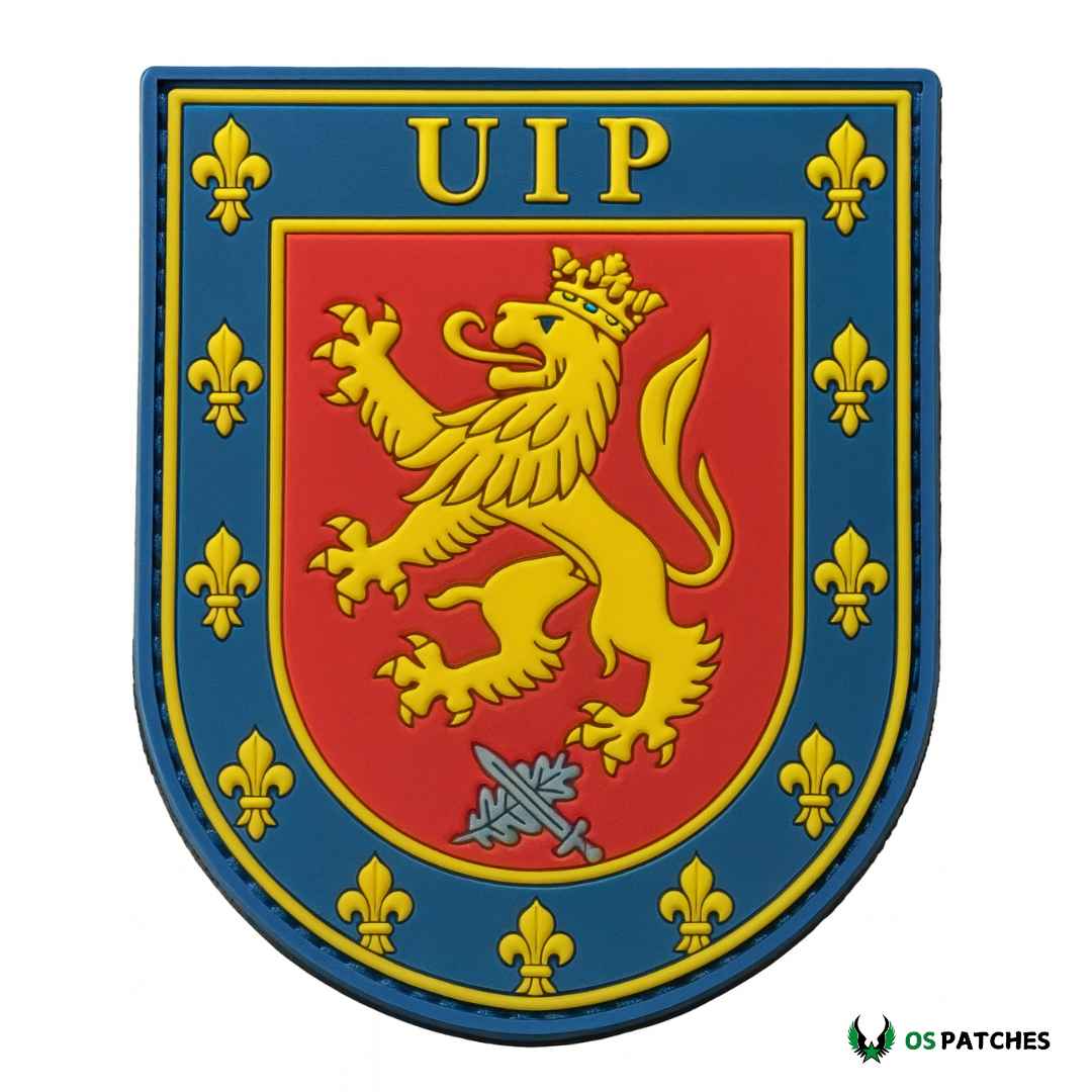 cada uno por 50Parche UIP en PVC resistente con león coronado y flores de lis. Ideal para uniformes, coleccionistas y amantes de los emblemas policiales españoles.